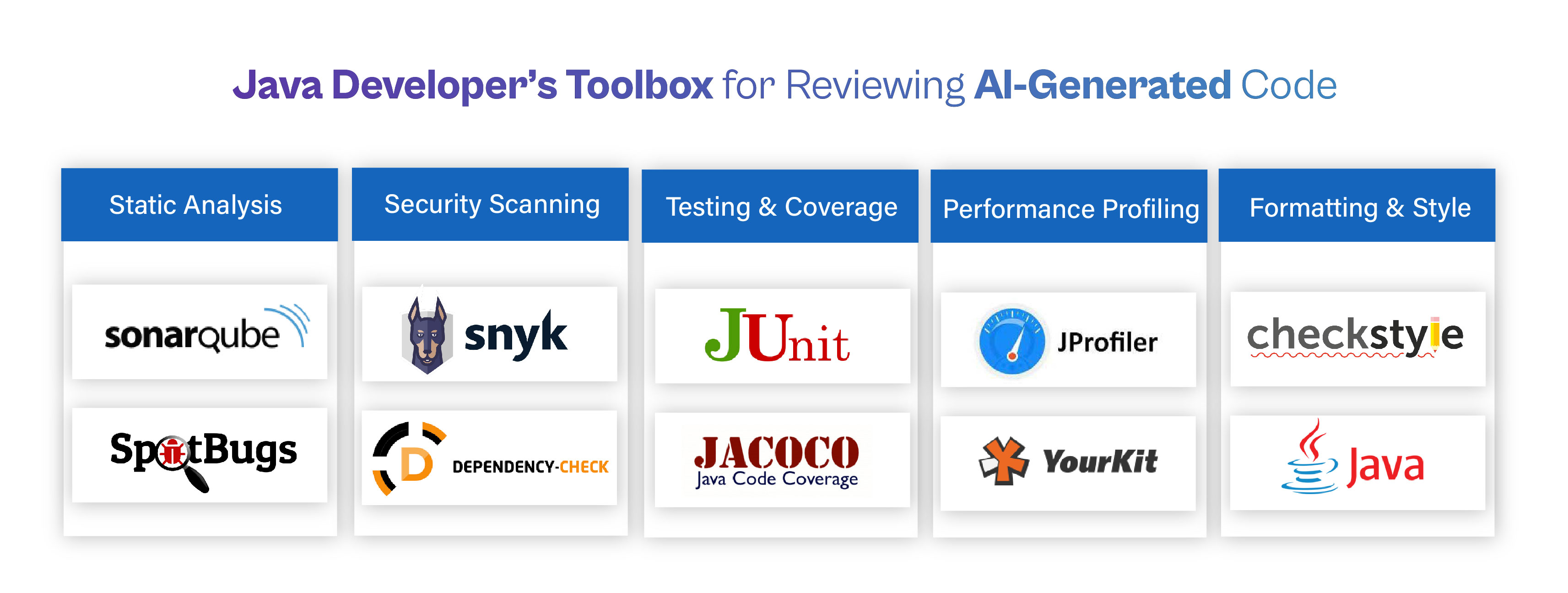 No single tool solves every problem, but a curated toolbox helps you catch defects and standardize quality. Static analyzers like SonarQube, SpotBugs, and PMD detect bugs, vulnerabilities and style issues and should run in your CI pipeline. AI‑assisted review tools such as Graphite, Diamond, and CodeGuru Reviewer examine pull requests and highlight inefficiencies. Security scanners, for example, Snyk and OWASP Dependency Check, evaluate third‑party libraries against known CVEs and flag risky code patterns. Formatting and style tools (e.g., Checkstyle, Google Java Format) ensure a consistent codebase, while testing and coverage frameworks like JUnit and JaCoCo measure and improve test completeness. Complement these with profilers (Digma, YourKit) to identify performance hotspots and AI‑powered autocompletion (e.g., Copilot, TabNine) to boost productivity. The right mix of tools amplifies the trust‑but‑verify workflow.